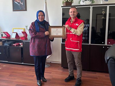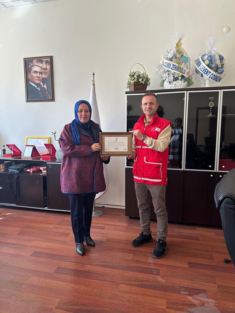 On October 7, 2025, representatives from the Turkish Red Crescent Gümüşhane Branch visited the Faculty of Tourism to present a certificate of appreciation to the Dean’s Office.