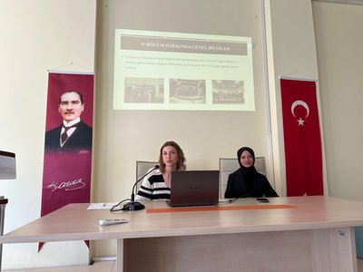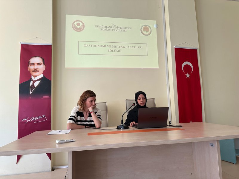 The program continued with departmental introduction presentations by Research Assistant Aleyna GÜN from the Department of Gastronomy and Culinary Arts and Research Assistant Zekiye Nur AKYÜREKLİ from the Department of Tourism Guidance. Their presentations included information about classrooms, academic staff, student clubs, and student-centered programs such as Erasmus.
